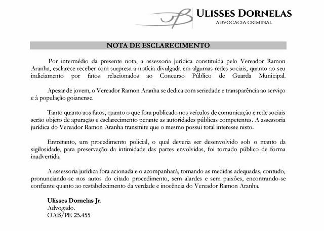 O candidato Ramon Aranha emitiu uma nota de esclarecimento sobre o caso e afirmou que recebeu com surpresa quanto ao seu indiciamento por fatos relacionados ao Concurso Público da Guarda Municipal. Confira abaixo a nota na íntegra.